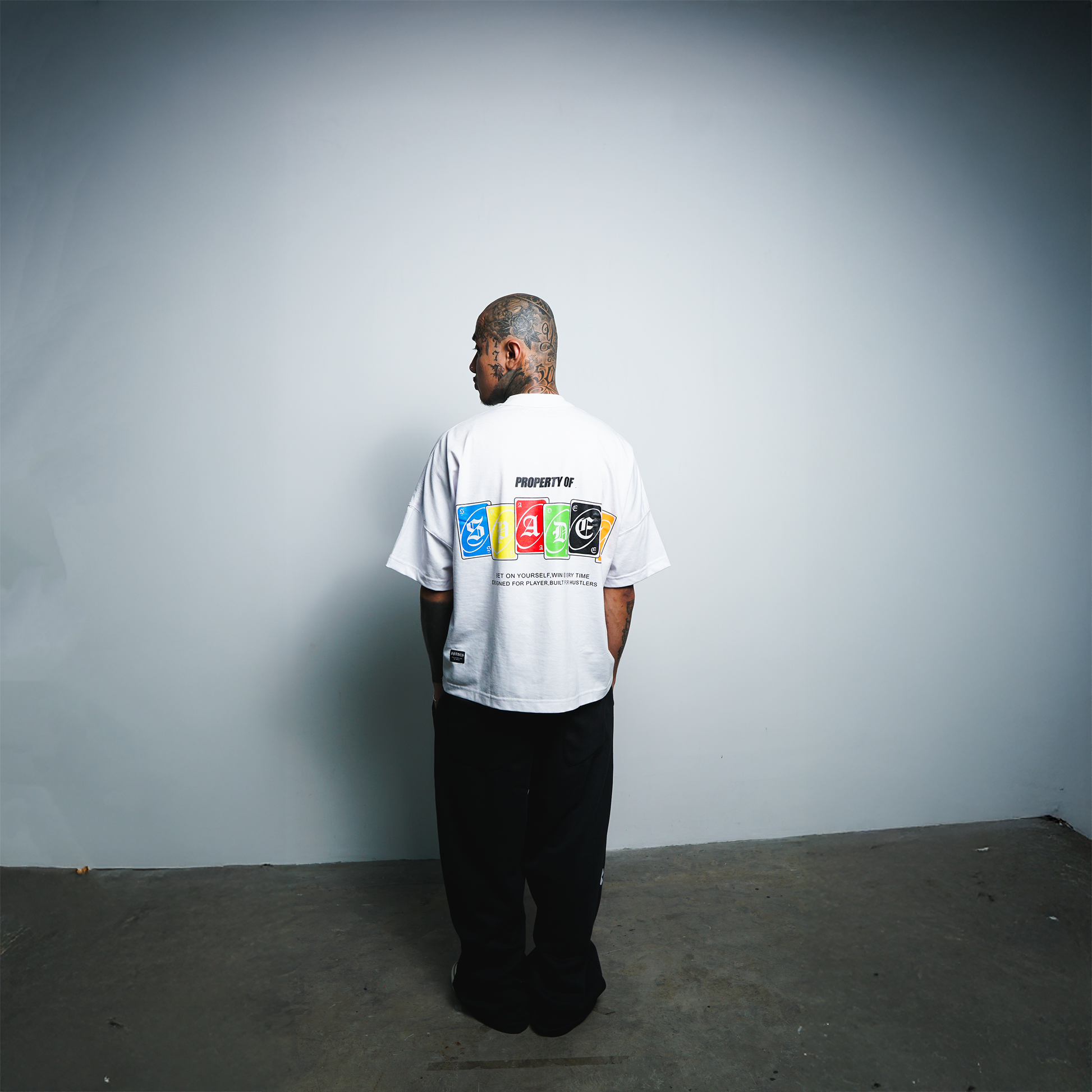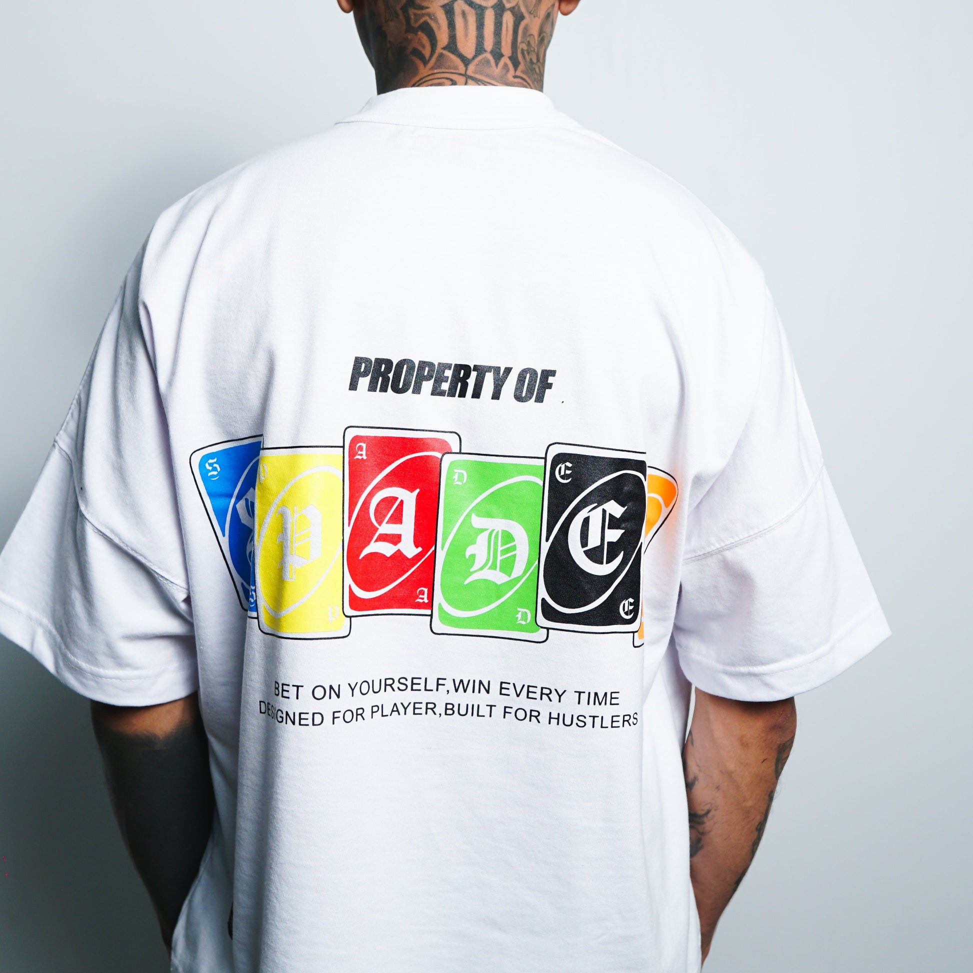 Streetwear meets strategy. Featuring colorful card-style letters spelling "SPADES," this tee’s design is all about stacking your deck and betting on yourself. On the back, a message every hustler knows by heart: “BET ON YOURSELF. WIN EVERY TIME.”