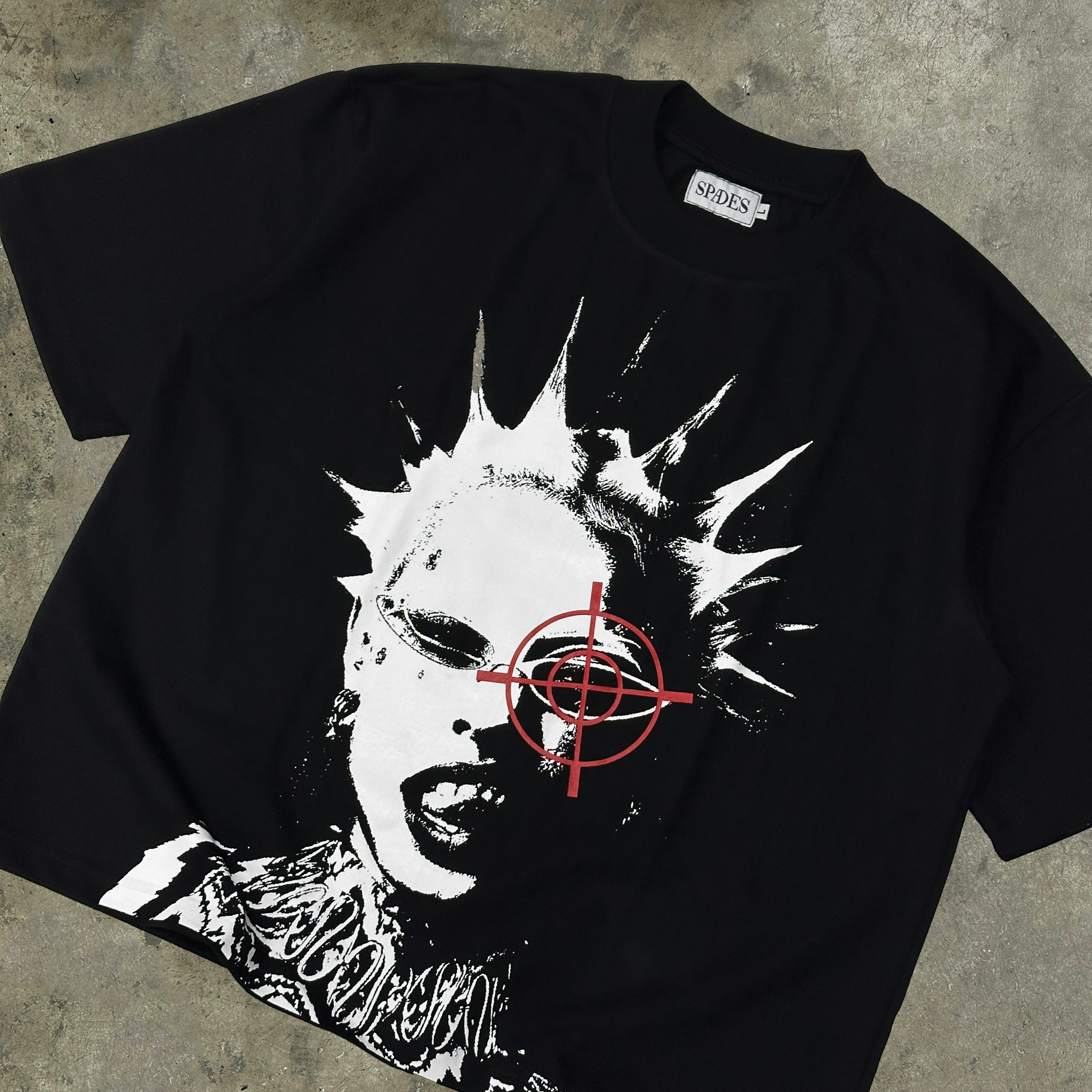 Channel raw, unbridled energy with the Punk Anarchy tee. Featuring a bold spiked hair graphic with a striking red target and "Spades" text, this black shirt embodies the essence of punk rock attitude with a modern twist. Crafted for durability and edge, it’s perfect for the fearless trendsetter ready to rock any scene.