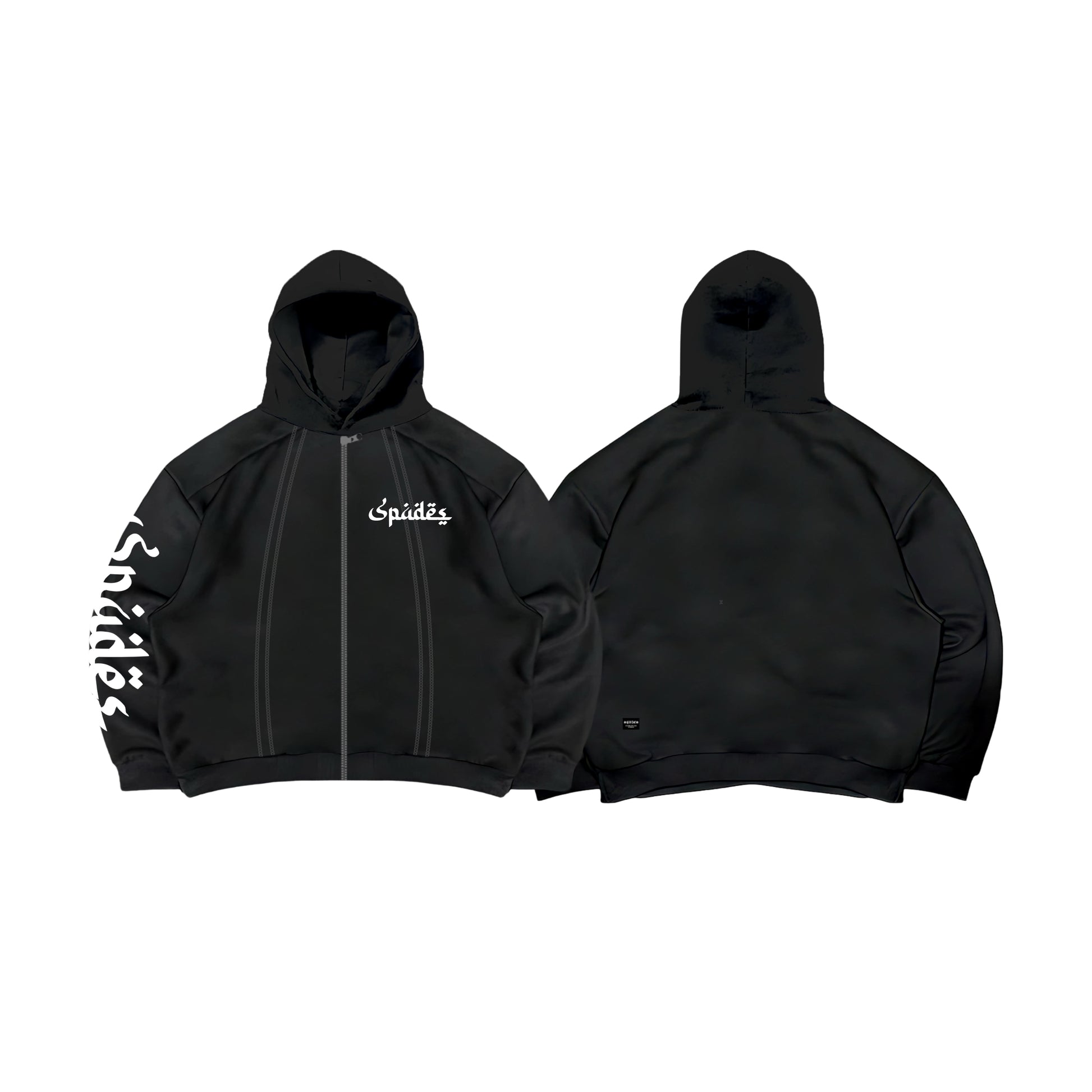 Step into the night with the Spades Midnight Merge, a striking two-piece set featuring a zip-up hoodie and matching pants. Crafted in deep black, this ensemble showcases bold "Spades" lettering cascading down the sleeve and leg, exuding a seamless blend of urban sophistication and mysterious allure. The hoodie offers a sleek design with a full zipper and cozy fit, while the pants provide a relaxed yet stylish cut with subtle stitching details. Perfect for those who seek a unified, standout look that merges comfort with a dark, enigmatic edge, this set is ideal for evening adventures or bold streetwear statements.